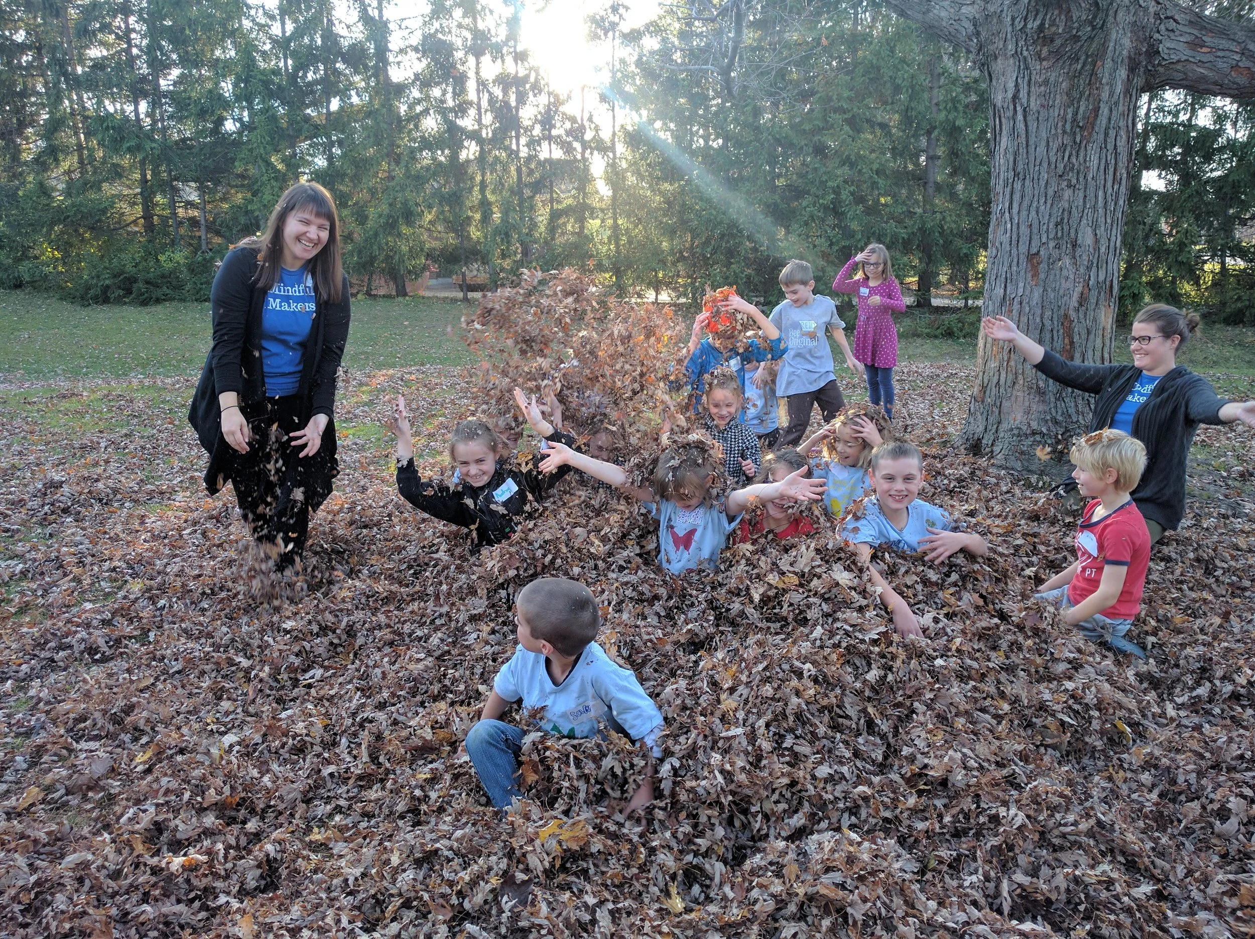 Enjoying the leaves in the backyard at our Nov. PA Day Camp.