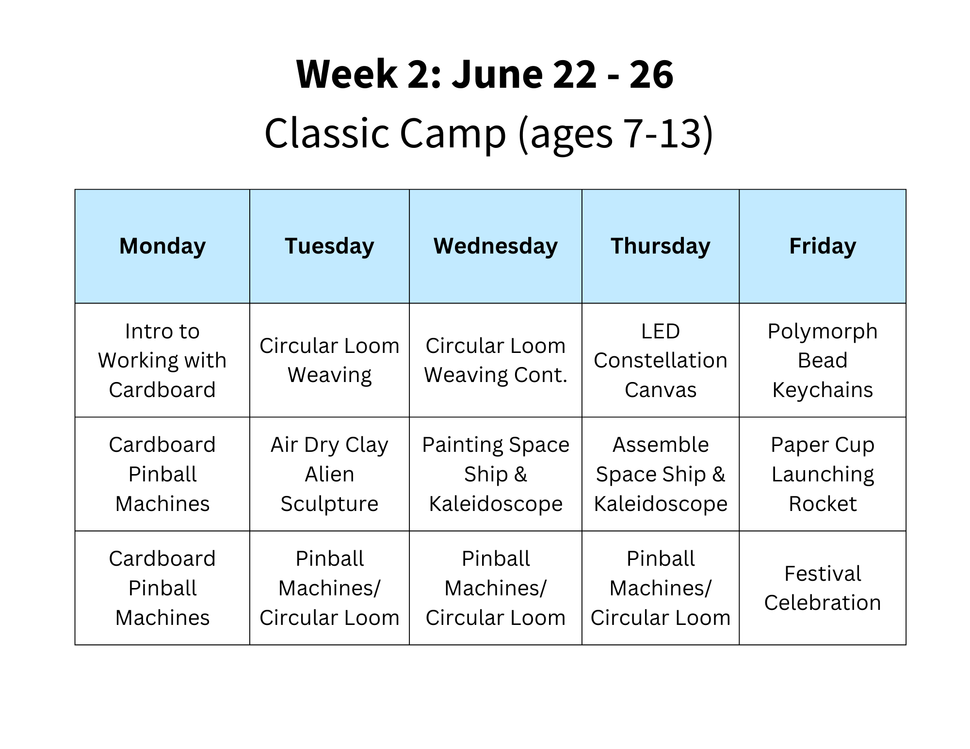 Please note: if you choose to enroll in any of our July/August camp weeks, the projects will be a repeat of what they learned in June.