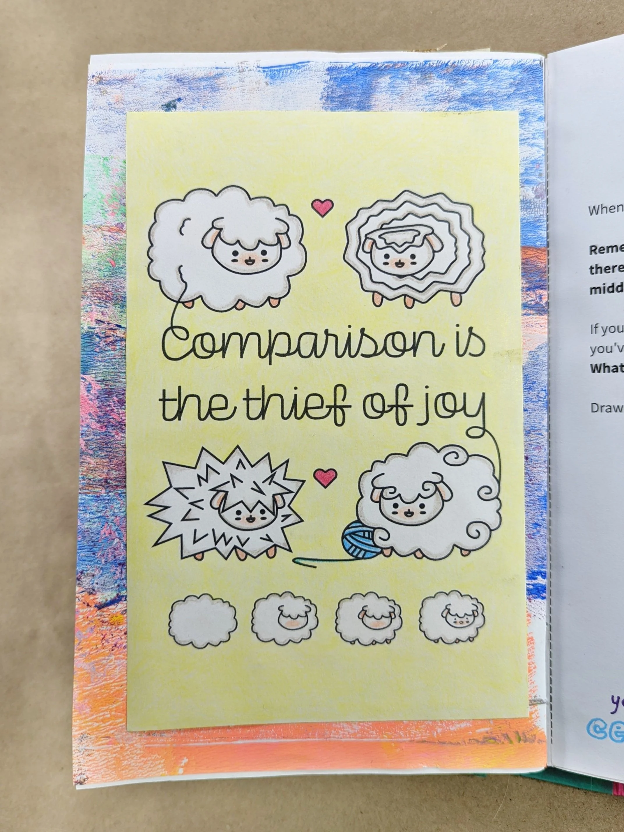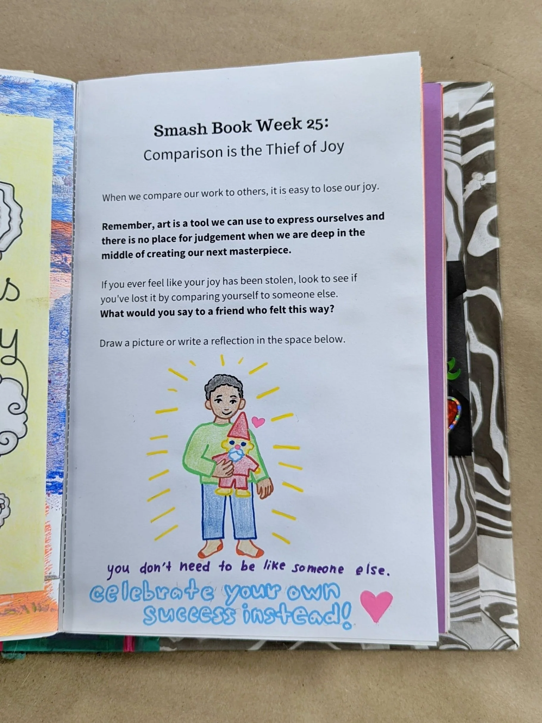 Next, take a few moments to reflect on the message on the next page. Try and remember a moment you have compared your artwork to others, and how it has negatively impacted your joy. Then, reflect this in the blank area at the bottom of the page; this could be a drawing, a short journal entry, or whatever you see fit! When you finish, paste it into your Smash Book using a glue stick.