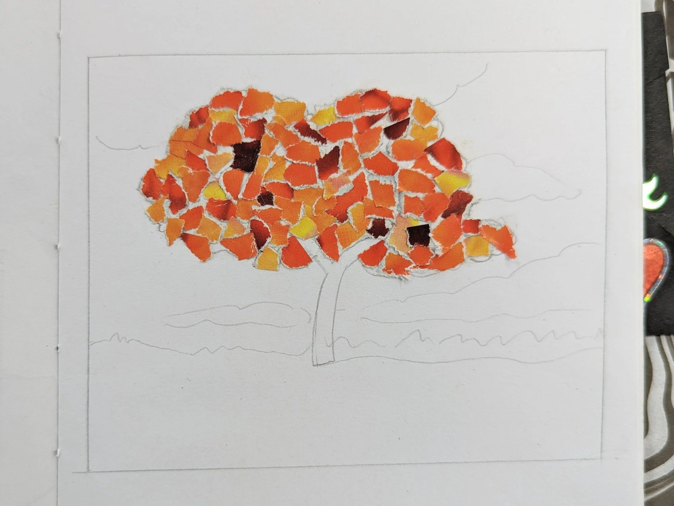 Step 4. Lastly, using a glue stick, paste the tiny paper pieces onto your drawn outline. Try and arrange the pieces so that they fit together, leaving small lines of white around them. Working with one colour or shape at a time will help you achieve the best results.