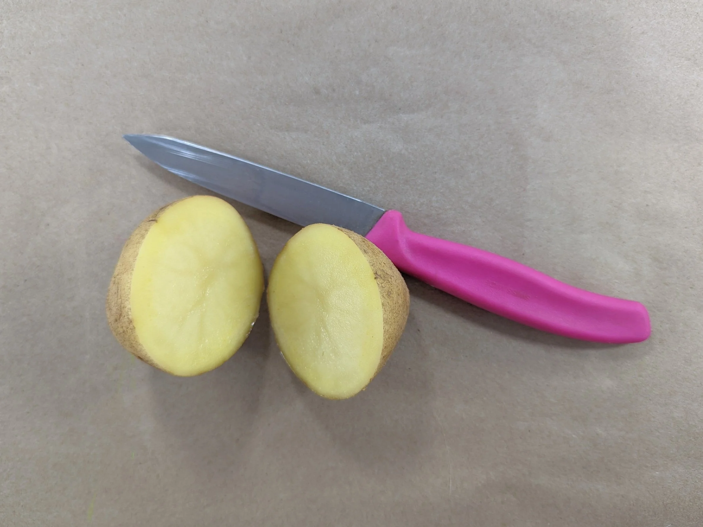 Step 2. Using a knife (ask an adult for help), cut the potato in half. Each potato will create two stamps!