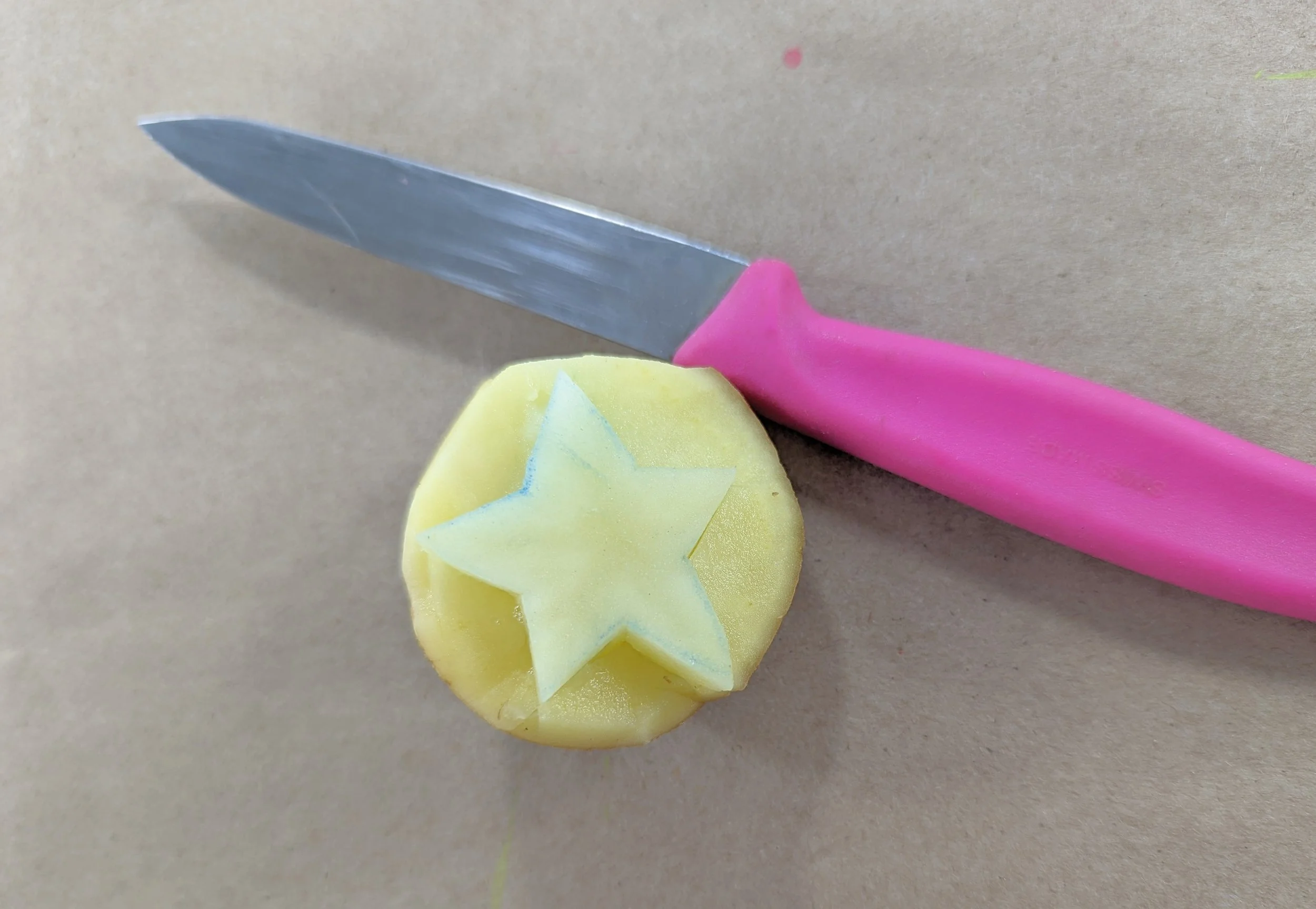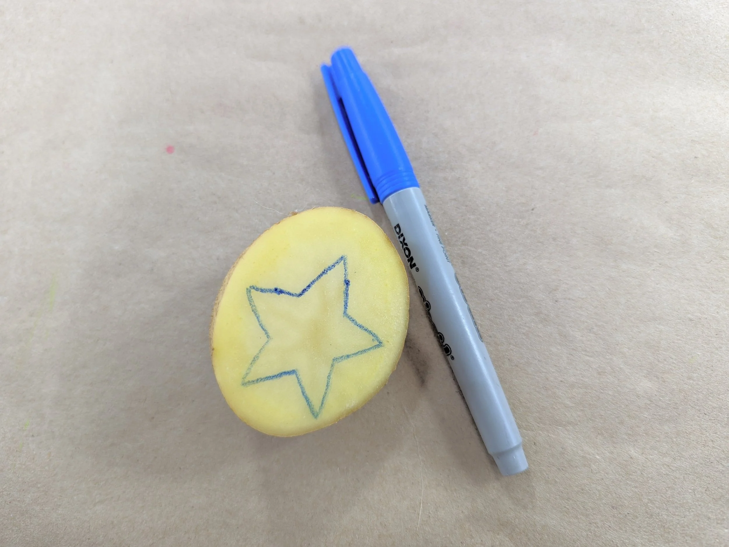 Step 1. First, gather your stamp making materials. Potatoes will work best as they are soft and easy to carve, but other fruits or vegetables such as apples or carrots will work as well.